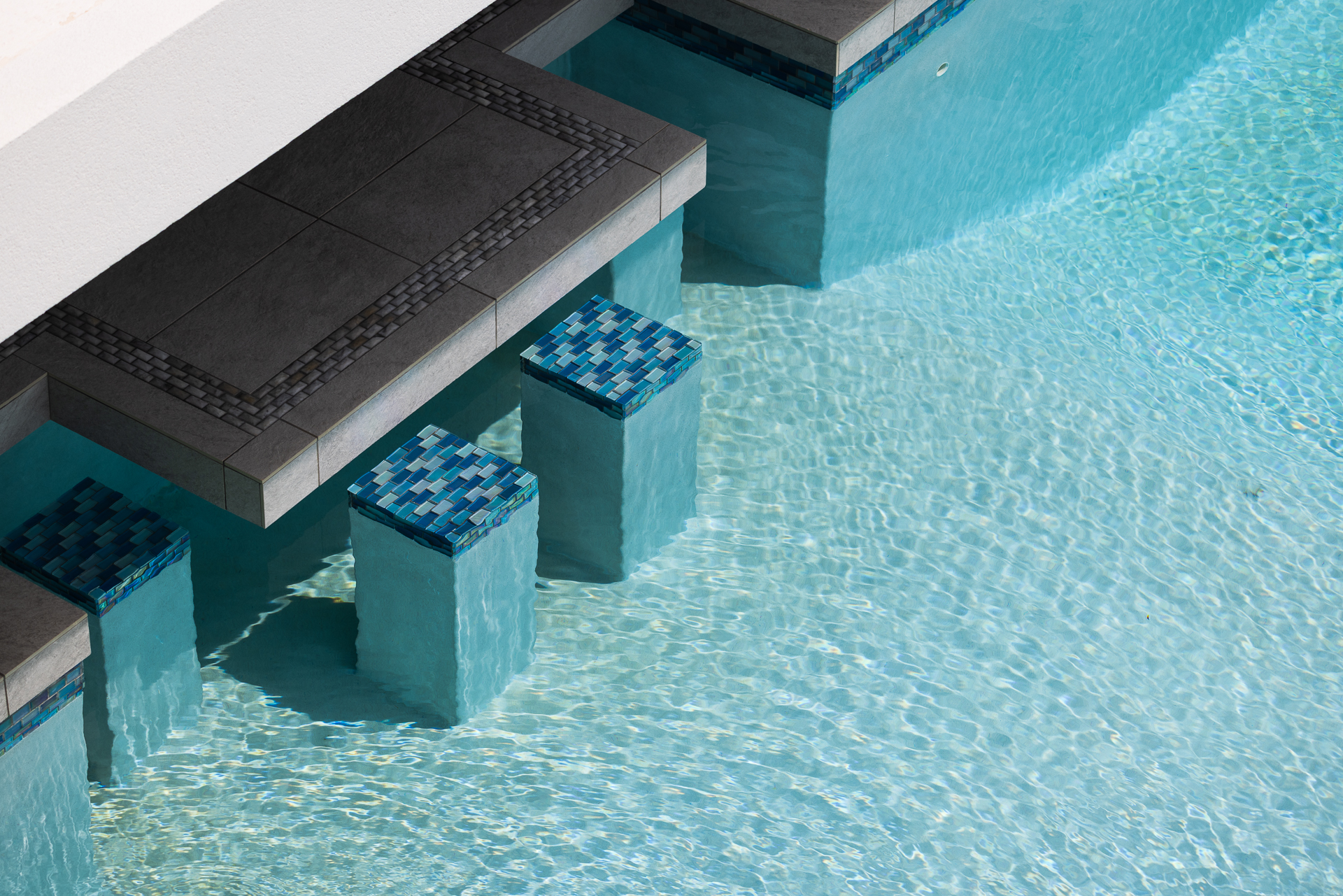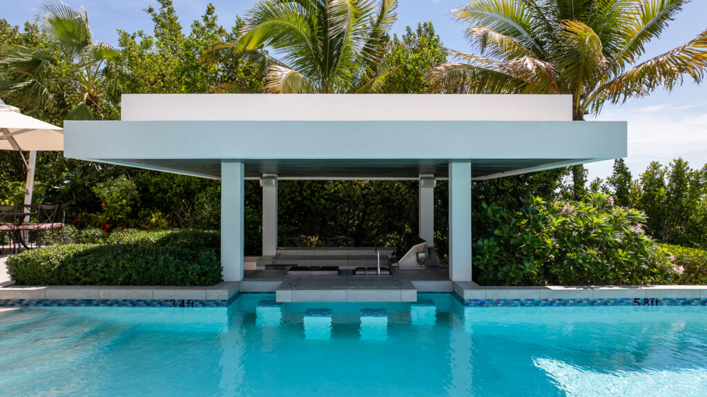 An expansive pool deck with open air lounge areas, swimming pool, a swim up pool bar, sunbathing glass deck, outdoor kitchen, grilling area, outdoor dining area and patio sun bathing decks.